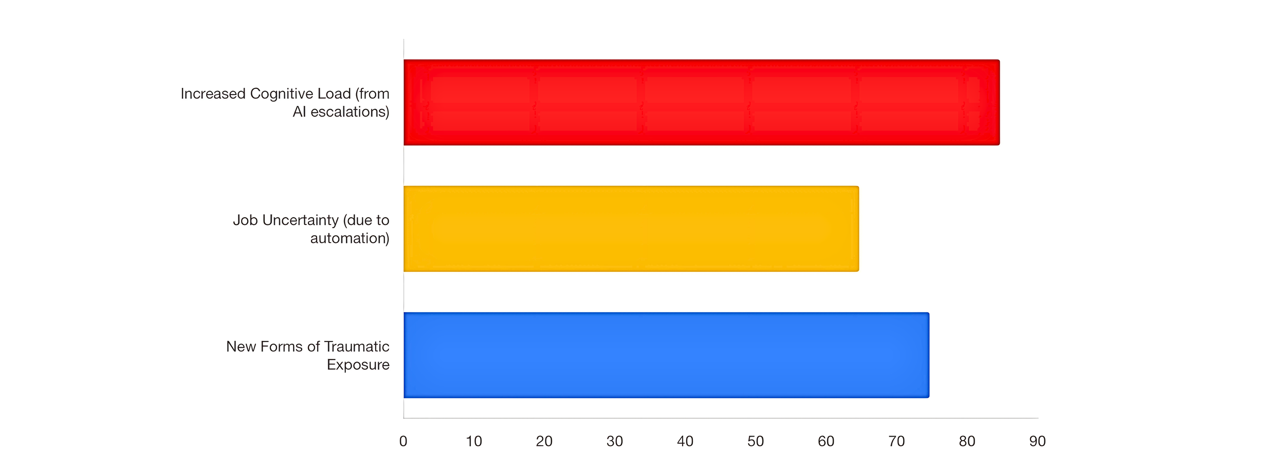 Trust & Safety professionals, especially now with AI in the picture are exposed to new form of stressors. The biggest challenge by far is the "Increased Cognitive Load" experienced from AI-driven escalations. Then there's the, "New Forms of Traumatic Exposure," . And it's also clear that "Job Uncertainty due to automation" is still a very real concern. It truly highlights just how much AI is reshaping the mental and emotional landscape for these crucial roles.